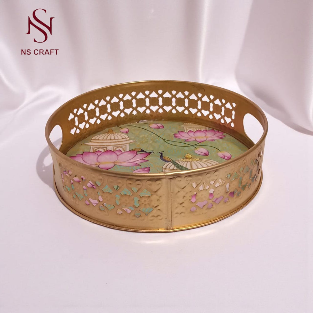 Elevate your festive celebrations and home aesthetics with the NS CRAFT Handcrafted Red Round Tray, a stunning decorative piece featuring traditional Pichwai cow and lotus artwork. Hand-painted by skilled artisans, this enamel-coated metal tray combines cultural artistry with functional elegance. Whether used as a pooja thali, a decorative table centerpiece, or a gift for loved ones, this tray reflects fine craftsmanship and Indian heritage. The vibrant red background adorned with sacred symbols like cows and lotus flowers makes it an auspicious addition to any festive setup or religious event. Its round shape and glossy finish make it both practical and visually appealing. This tray is also a versatile gift item perfect for Diwali, weddings, griha pravesh, or return favors. Add a touch of tradition and artistic charm to your space with this exquisite creation from NS CRAFT.