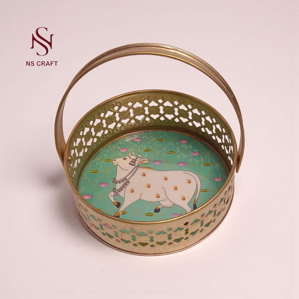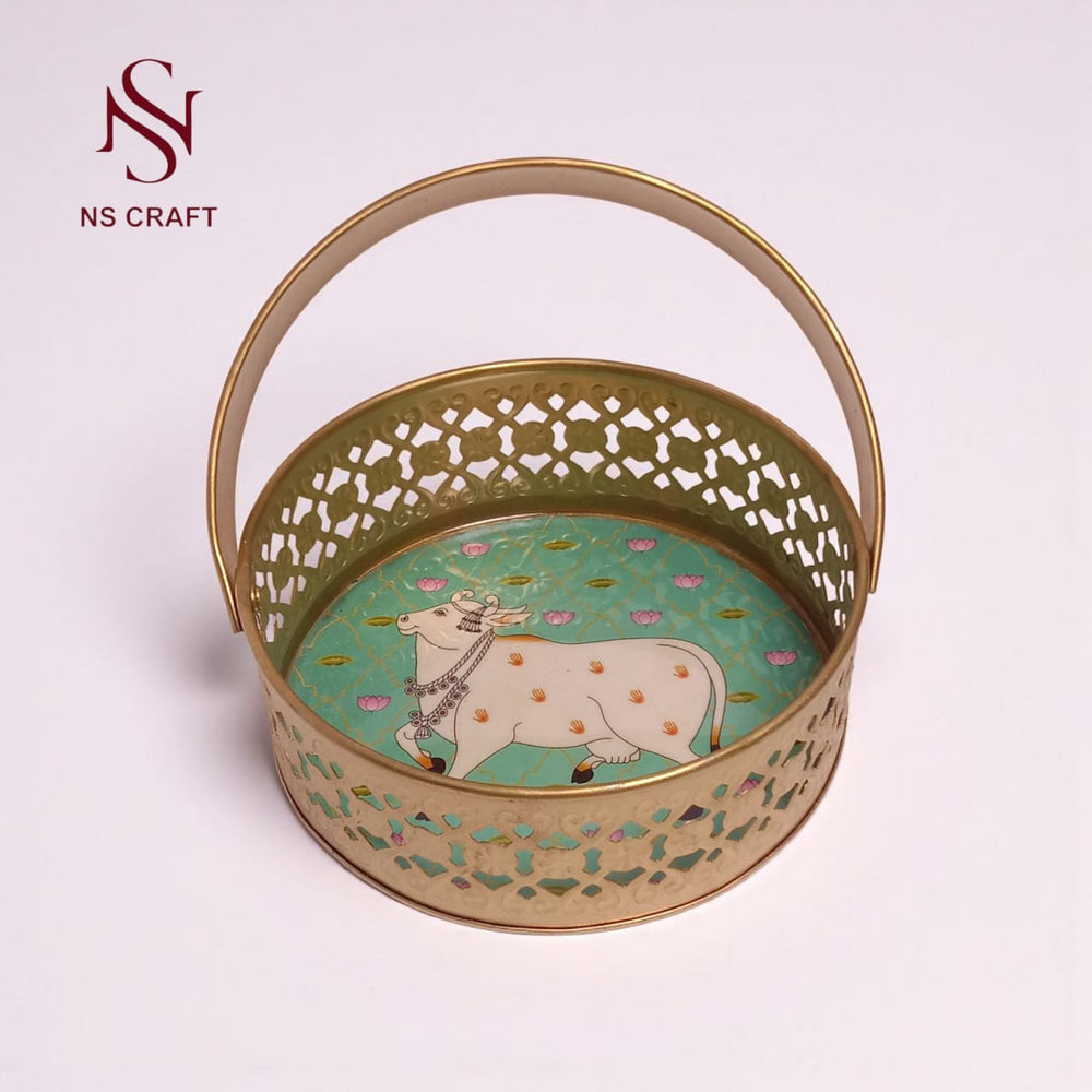 Celebrate culture and tradition with the NS CRAFT Iron Powder Coated Pichwai Tray with Handle. This round tray is adorned with vibrant cow motifs inspired by classic Pichwai art and features a powder-coated iron finish that ensures durability and elegance. Whether you're serving sweets and snacks or using it as a decorative pooja thali, this tray suits a variety of purposes. The convenient side handles make it easy to carry, and its unique design makes it an excellent choice for festive décor or thoughtful return gifting. Perfect for Diwali, weddings, housewarmings, or home décor lovers.